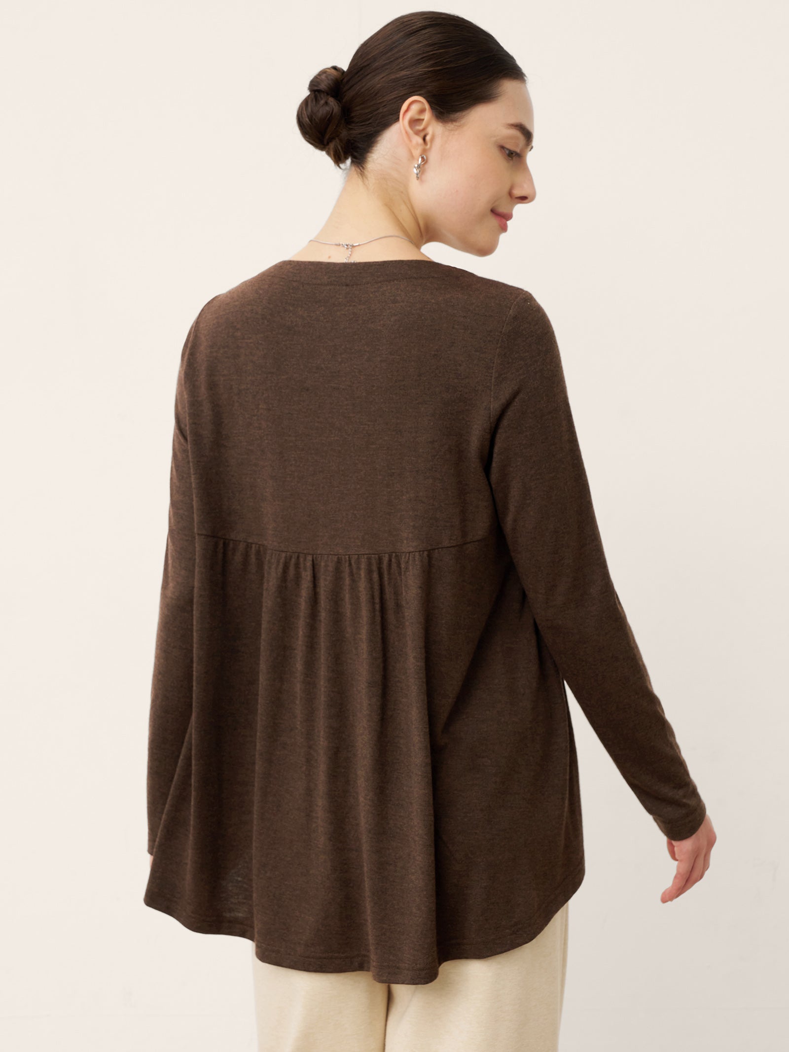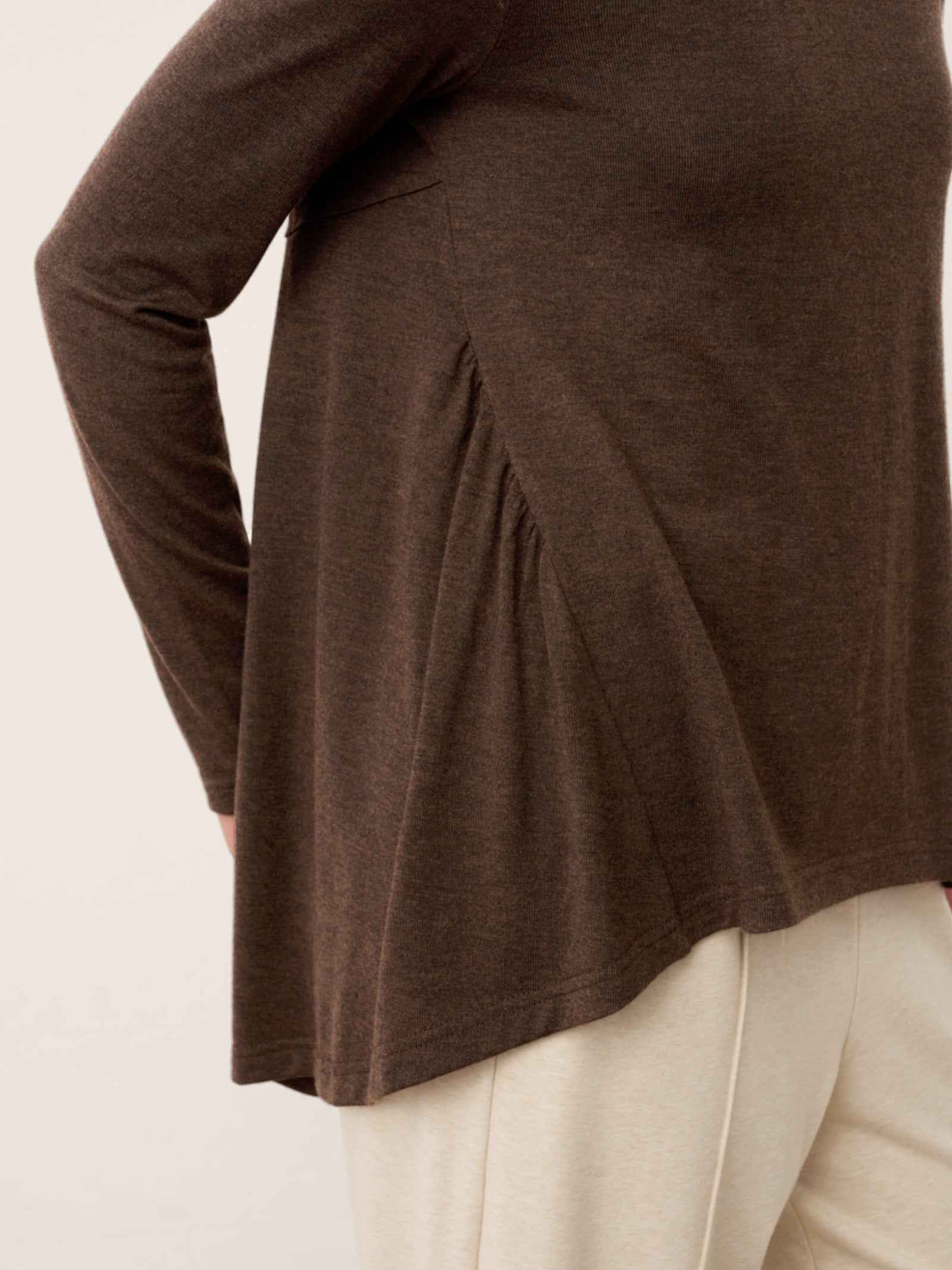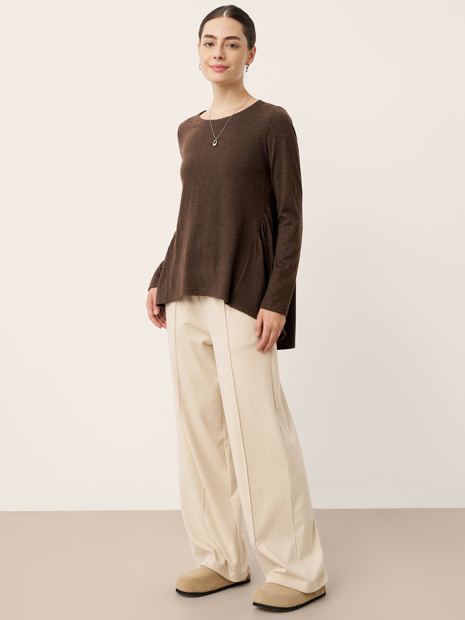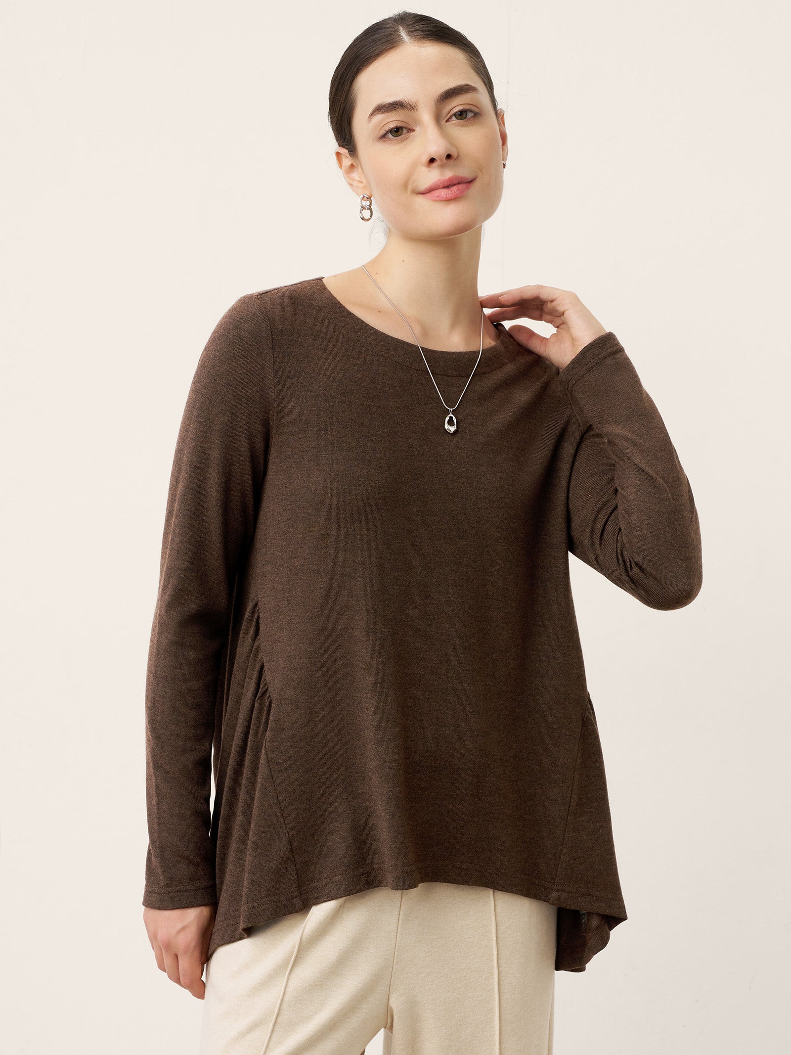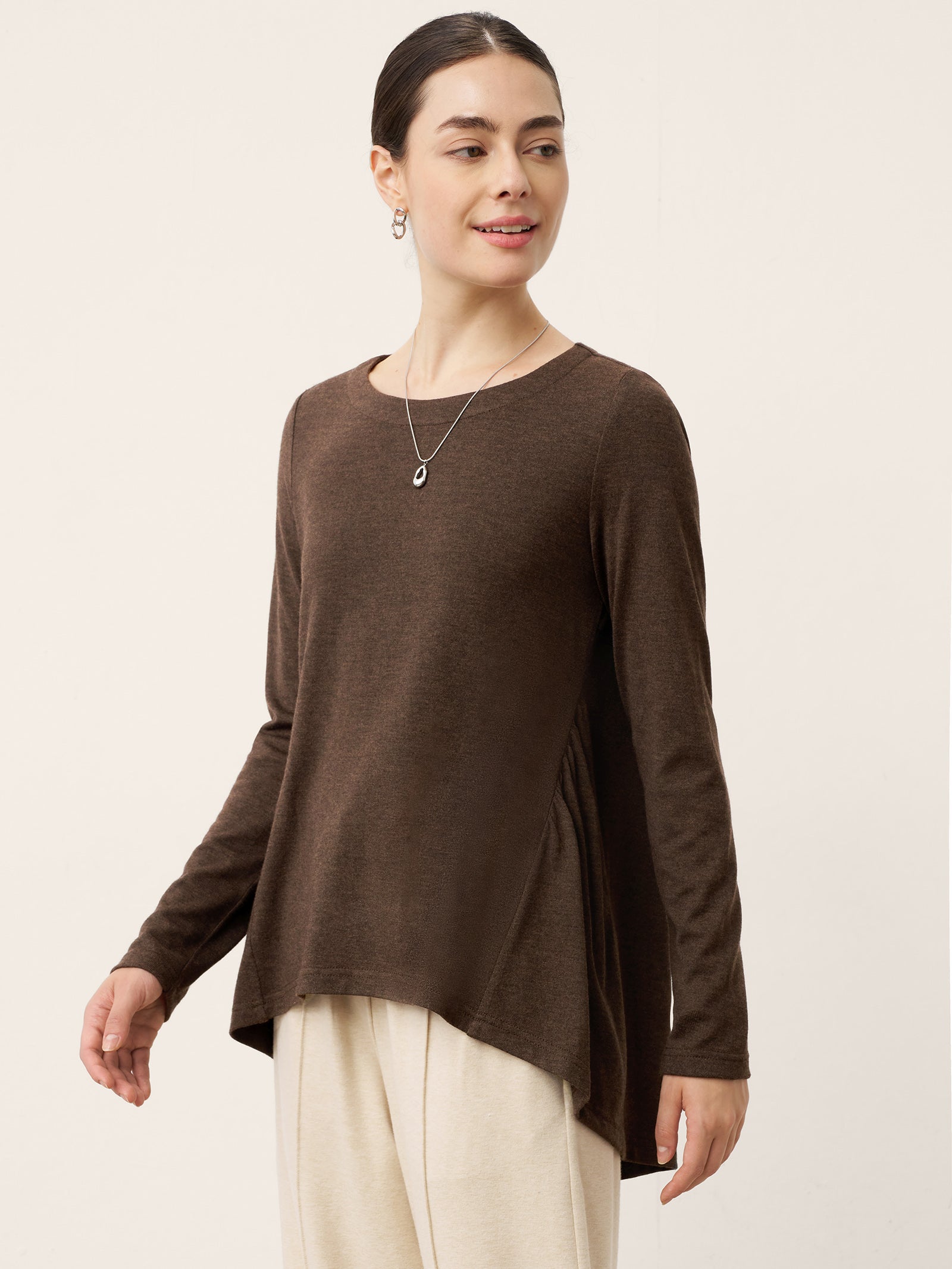 Glissez-vous à travers les saisons avec une sophistication douillette : ce haut en laine couleur café vous enveloppe d'une étreinte douce avec un froncage artistique à la taille et une silhouette trapèze, tandis que son ourlet asymétrique danse avec une grâce fluide pour rehausser chaque pas.