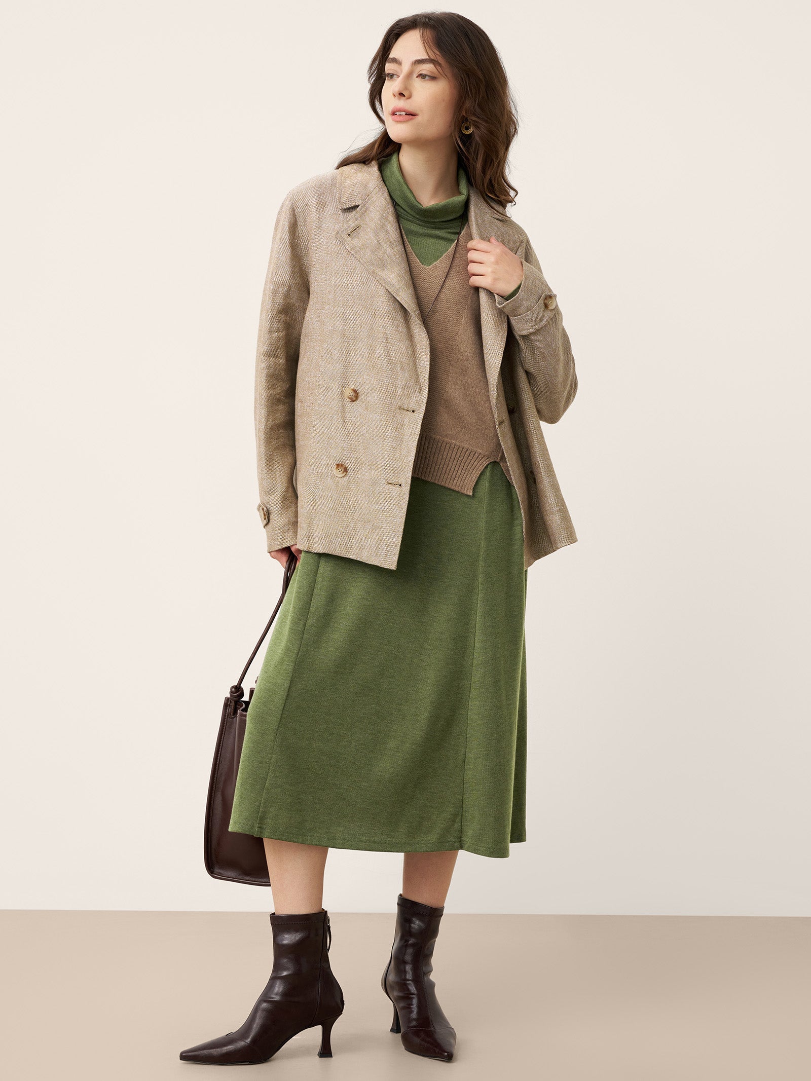 Une robe maxi en laine de couleur olive tactile où d'élégants plis sculptés créent un mouvement fluide, tandis que le col roulé gracieux rehausse l'allure à chaque pas.
